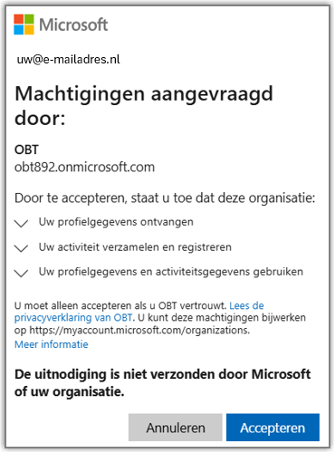 Je hebt een uitnodigingsmail van Microsoft ontvangen (zie voorbeeld hieronder) voor het activeren van je account voor het factuursysteem InvoiceIN. Open deze mail op je PC of laptop (niet op je telefoon).