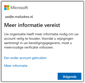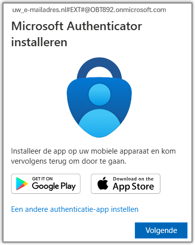 Indien je deze app nog niet op je telefoon hebt staan, installeer dan nu de Microsoft Authenticator-app op je telefoon. Klik daarna op Volgende