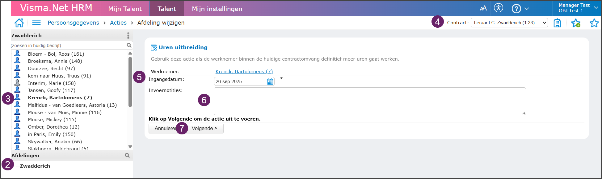In de vorige paragrafen is beschreven welke acties er gestart kunnen worden om mutaties door te geven via Visma HRM. In deze paragraaf gaan we de acties nader toelichten. De eerste twee instructies worden uitgebreid toegelicht met schermafdrukken. De overige acties lijken op de voorgaande en worden daarom minder uitgebreid toegelicht.