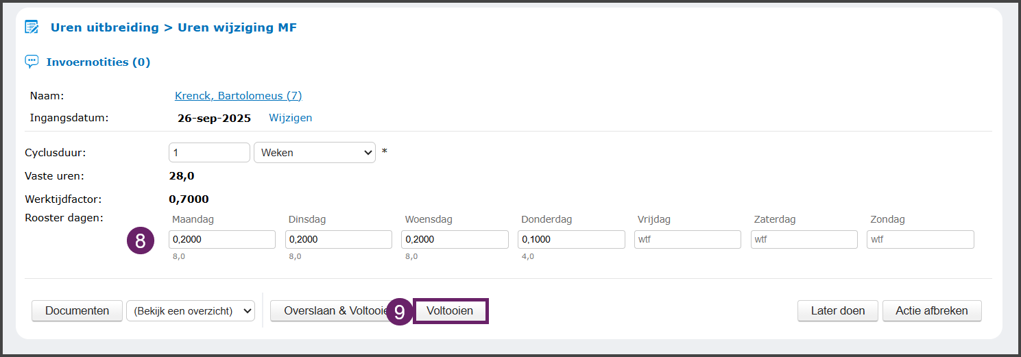 Vul het rooster in zoals de werknemer gaat werken met aantal te werken uren per dag.