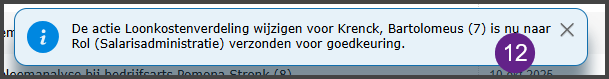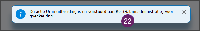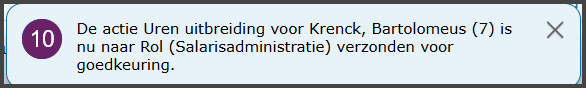 - Je krijgt een blauwe pop-up in beeld dat de actie verzonden is naar gebruiker die goedkeuring moet geven. In dit voorbeeld betreft dit de salarisadministratie.