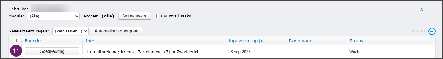 De gebruiker die de uren wijziging moet goedkeuren, ziet dit als taak in het taakoverzicht. Klik op de taak.