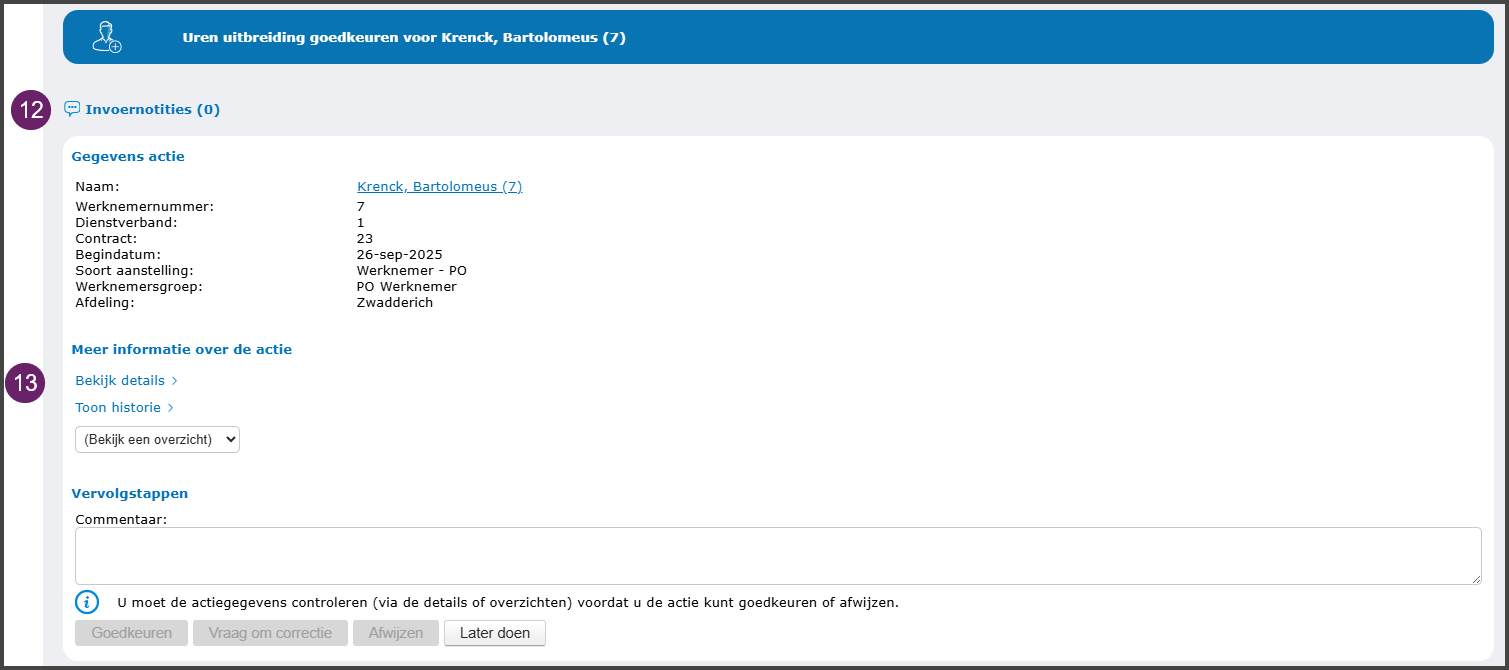 - Klik op ‘Vraag om correctie’ om de initiatiefnemer van de actie om een correctie te vragen. Vul hiervoor het getoonde commentaarveld in. De initiatiefnemer ontvangt een taak met dit commentaar.