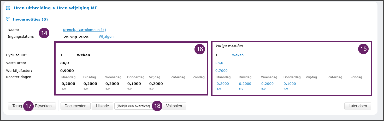Naast de naam van de werknemer en ingangsdatum van de wijziging, worden de nieuwe contracturen, werktijdfactor en rooster getoond.
