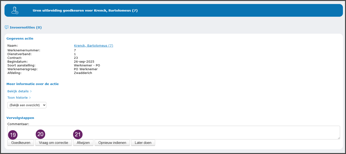 Klik op ‘Vraag om correctie’ om de initiatiefnemer van de actie om een correctie te vragen. Vul hiervoor het getoonde commentaarveld in. De initiatiefnemer ontvangt een taak met dit commentaar.