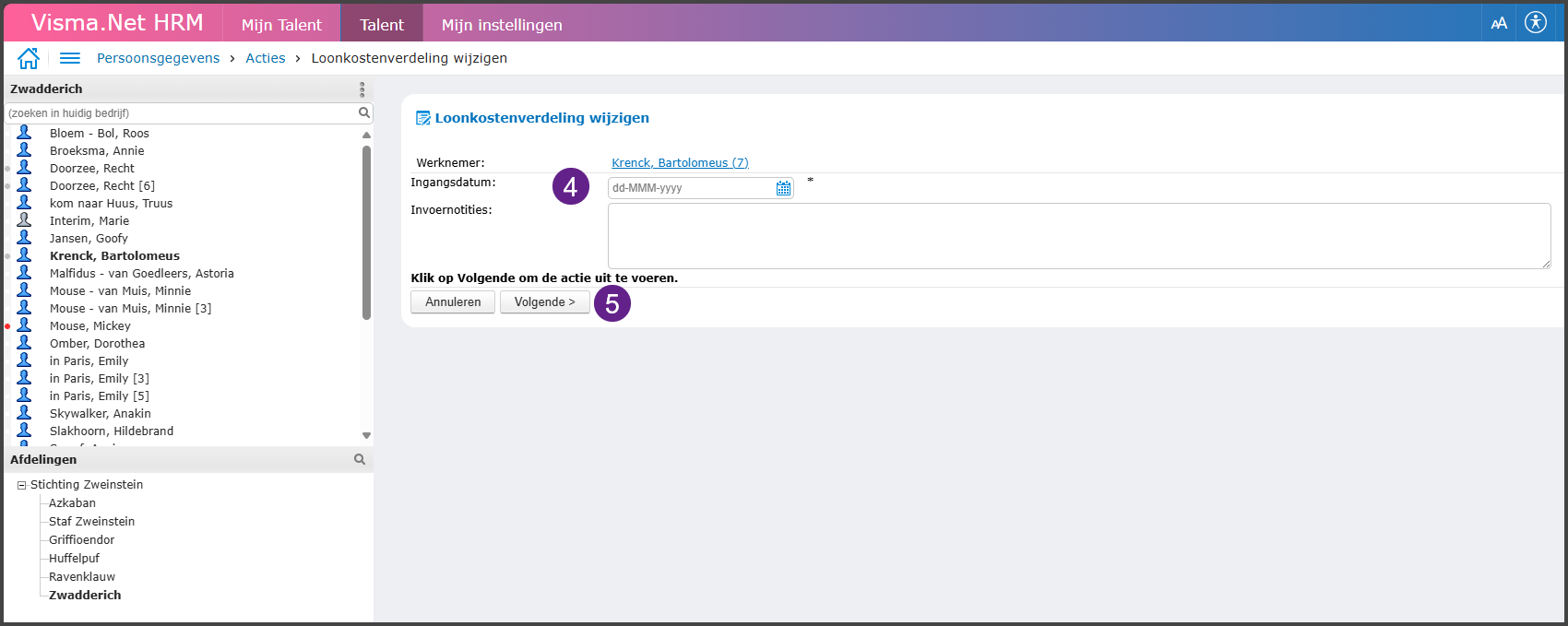- Vul de ingangsdatum van de wijziging in. Vanaf welke datum gaat de werknemer werken voor een andere afdeling.