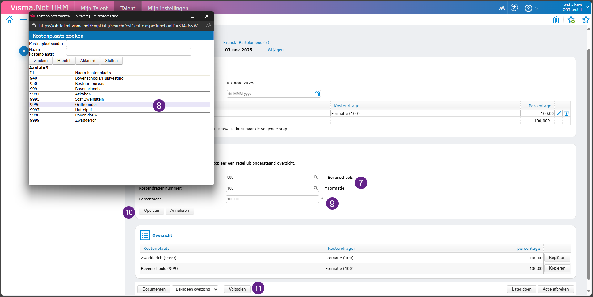 - Selecteer de juiste kostenplaats of drager in de pop-up. Dit is voor beide afzonderlijk aan te passen.