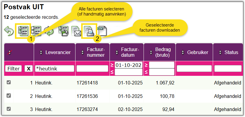 Wanneer u facturen zoekt van een bepaalde leverancier, voer dan altijd een sterretje * in voor uw zoekopdracht, gevolgd door een klein deel van de naam van de leverancier die u zoekt. Doet u dit niet dan kan het voorkomen dat u niet vindt waar u naar op zoek bent.