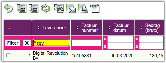 Zie onderstaande afbeelding als voorbeeld, hier wordt een factuur van Digital Revolution gezocht. Door een sterretje voor de zoekopdracht te plaatsen wordt door het systeem ook gekeken naar of de gezochte tekst verderop in de leveranciersnaam voorkomt.