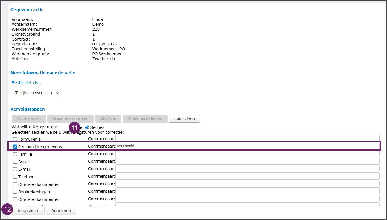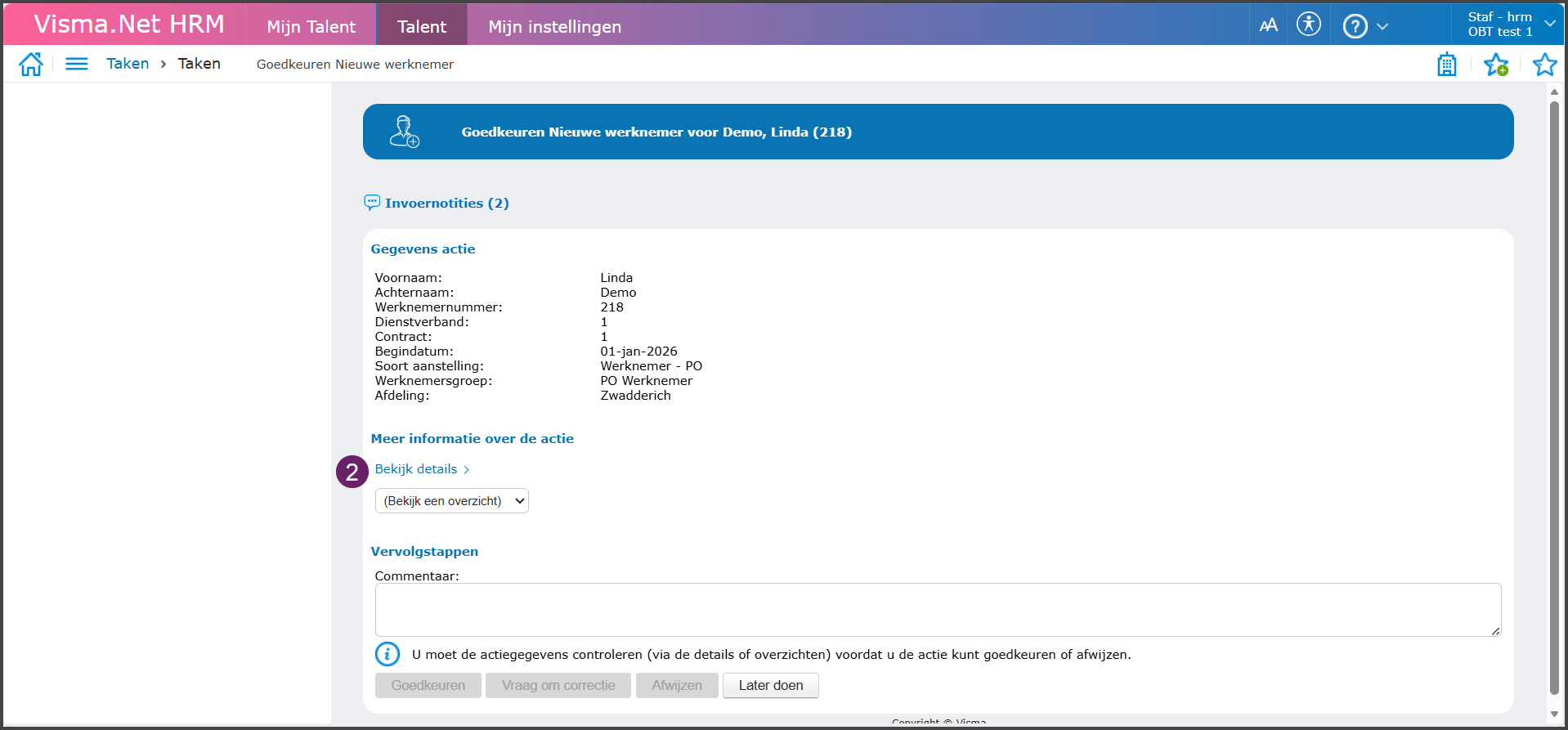 - Zijn er secties waarin een wijziging nodig is, waarin je geen rechten hebt? Klik op 'Vraag om correctie'. Klik op 'Goedkeuren' om de actie nieuwe werknemer goed te keuren. Het proces met taken voor de contactpersoon van ObT en de werknemer wordt gestart.