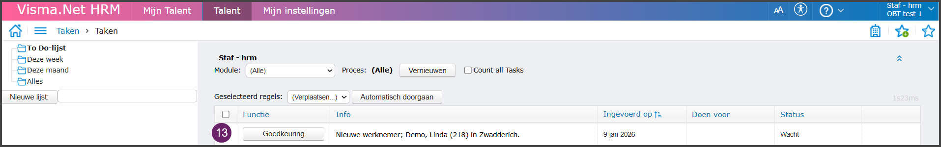 Enkele contractmutaties moeten worden goedgekeurd, voordat deze door ObT worden verwerkt. Dit kan bijvoorbeeld een urenwijziging zijn. Afhankelijk van de inrichting en je rol in Visma HRM is het mogelijk dat je een taak krijgt om een mutatie goed te keuren.