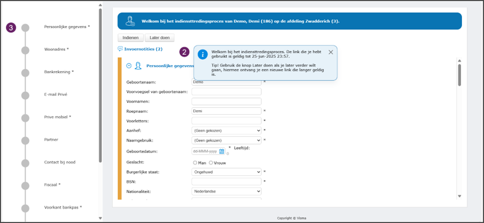 De link in het e-mailbericht is 30 dagen geldig, totdat je op de link hebt geklikt. Heb je de link aangeklikt, is de link één dag geldig. Wil je op een later moment de gegevens invullen? Klik dan in het formulier op ‘Later doen’. Je ontvangt een nieuwe link per e-mail met een langere geldigheid. Wacht echter niet te lang met het invullen van de persoonlijke gegevens!