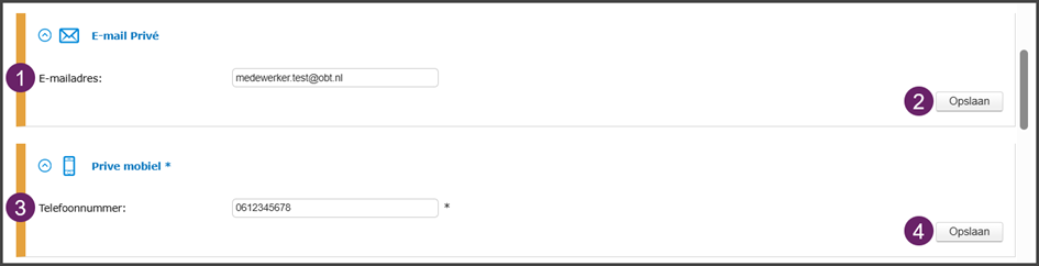 - Vul een mobielnummer in zonder koppelteken. Als ObT voor het bestuur de arbeidsovereenkomsten verzorgt, dan wordt dit nummer gebruikt voor het digitaal ondertekenen van de arbeidsovereenkomst.
