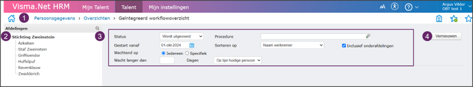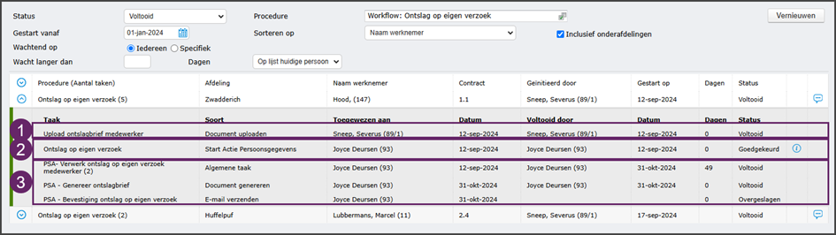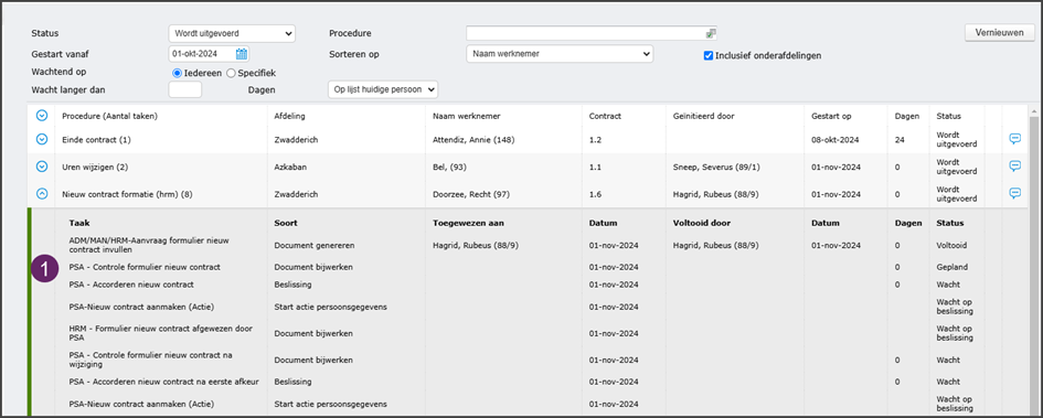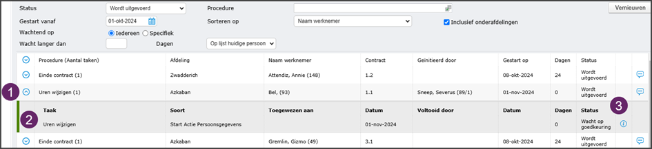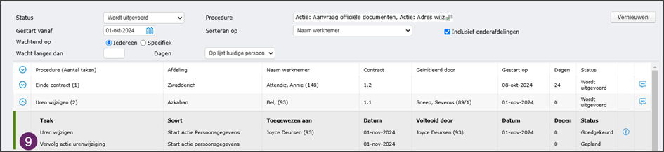 Sorteren op: naam werknemer, nummer, naam procedure, gestart op of dagen - Klik op vernieuwen na het instellen van de juiste filters.