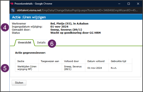 - Als dit proces is goedgekeurd volgt er nog een actie. Deze wordt niet direct getoond. Hier zul je rekening mee moeten houden. Je blijft wel inzage houden in de eerste gestarte actie en taak, zoals in dit voorbeeld de uren wijzigen.