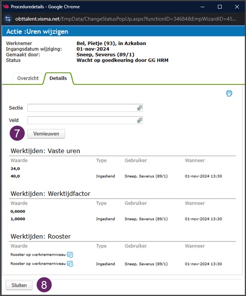 - Klik op ‘Vernieuwen’. Je ziet de oude waarde en de nieuwe waarde. Als de wijziging als is goedgekeurd door HRM bv, zie je deze gegevens hierin ook staan.